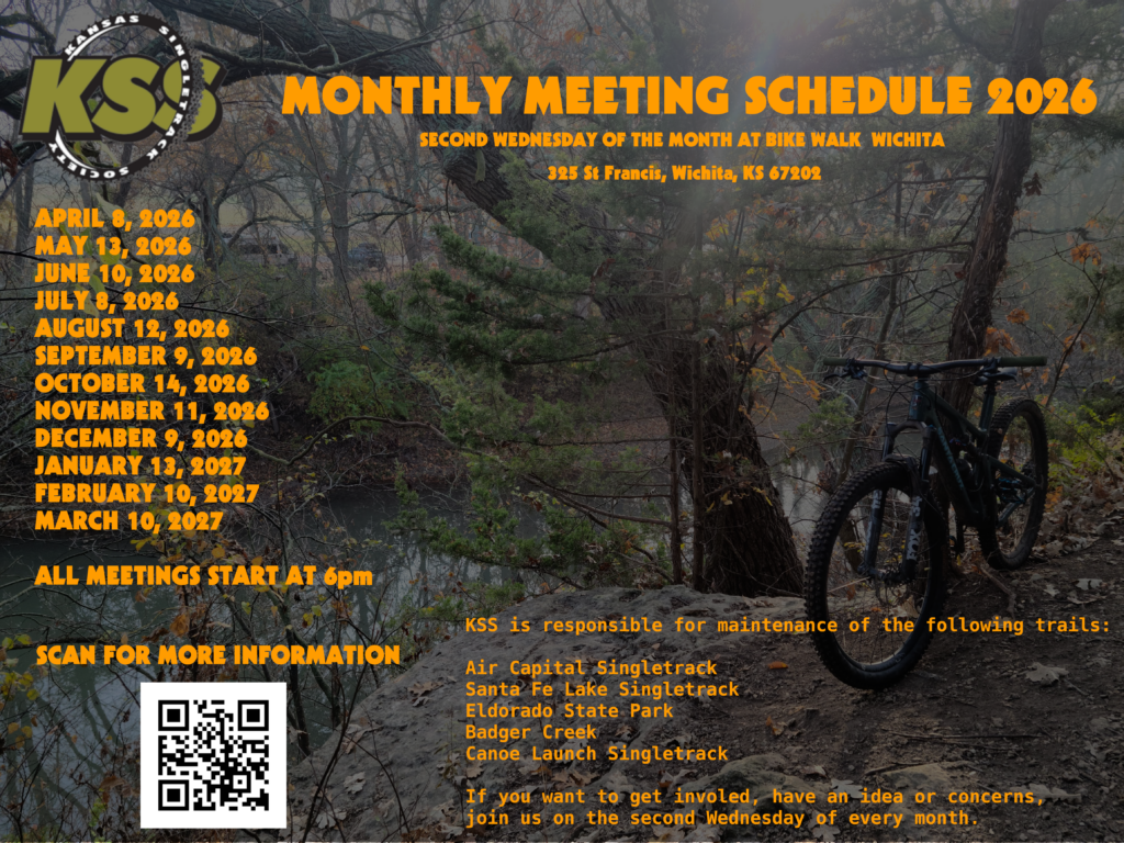 Do you have issues, concerns ideas for improvement or just want to be more involved with KSS? You should join us the second Wednesday of every month at Bike Walk Wichita 325 St Francis, Wichita, KS 67202. The fun starts at 6PM, we’ll cover business items first, tail conditions, future work, work days, events, etc, leaving the last part of the meeting open to KSS members to voice concerns or present ideas.